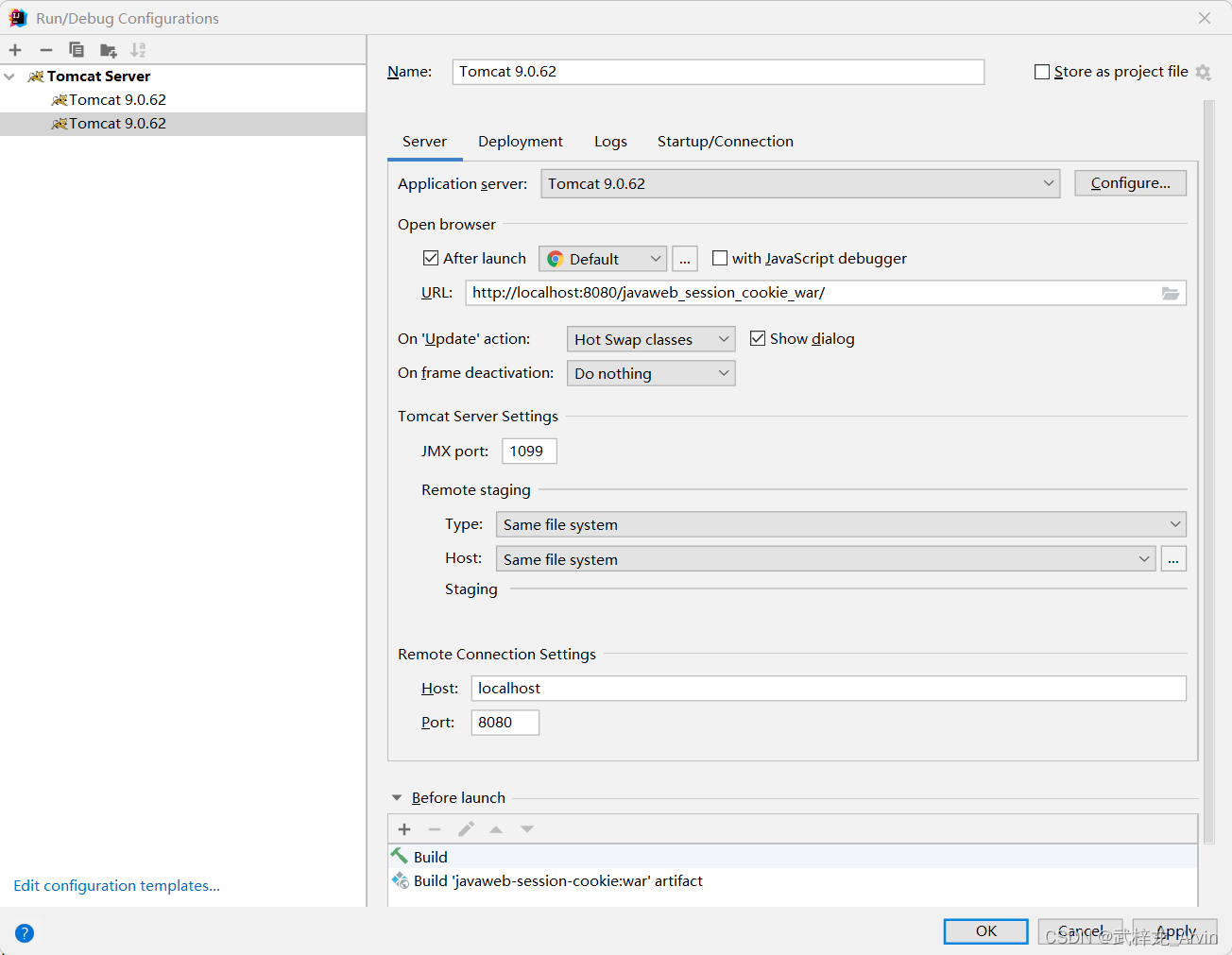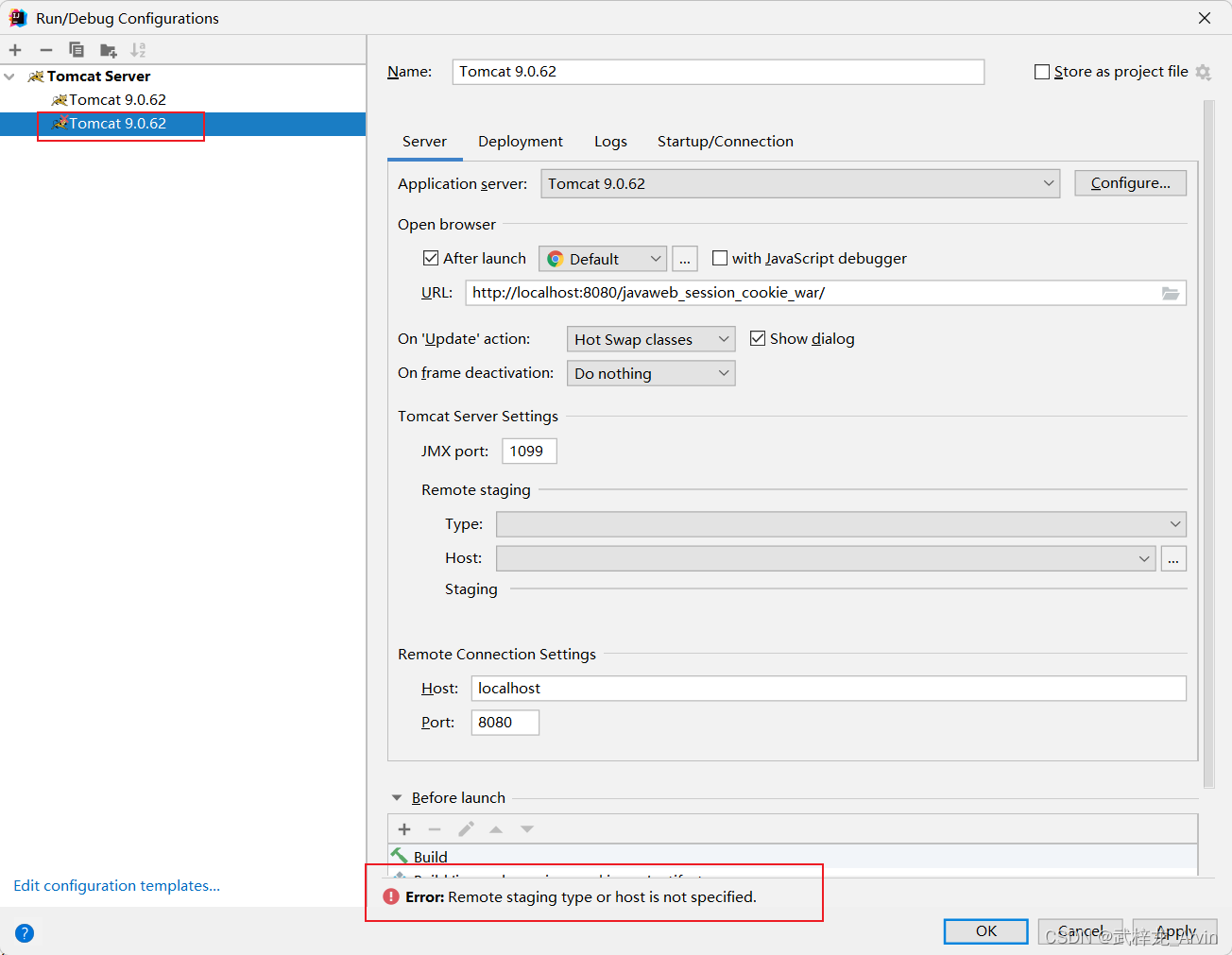 1.在IDEA中配置Tomcat的过程中提示Error:Remote staging type or host is not specified.是因为我们没有选择对应的Remote Staging