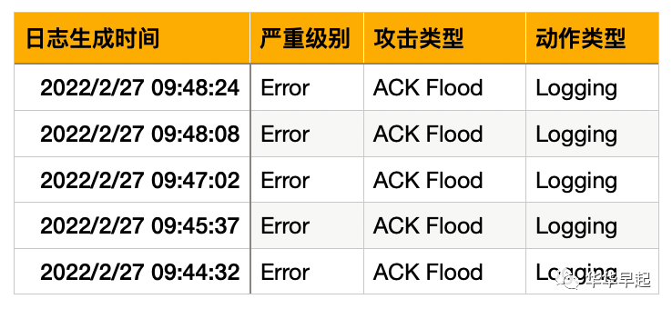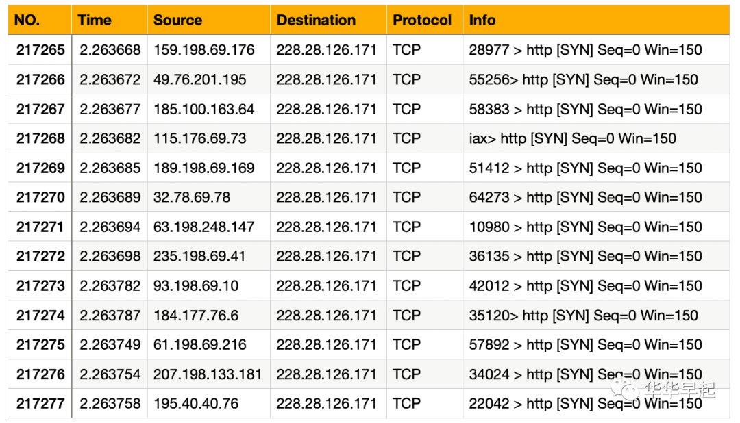 分布式拒绝服务DDoS 常见的攻击方式有SYN Flood,UDP Flood, ICMP Flood, Connection Flood攻击、HTTP Get攻击和UDP DNS Query Flood攻击。题目中防火墙日反应的就是SYN Flood攻击的信息。