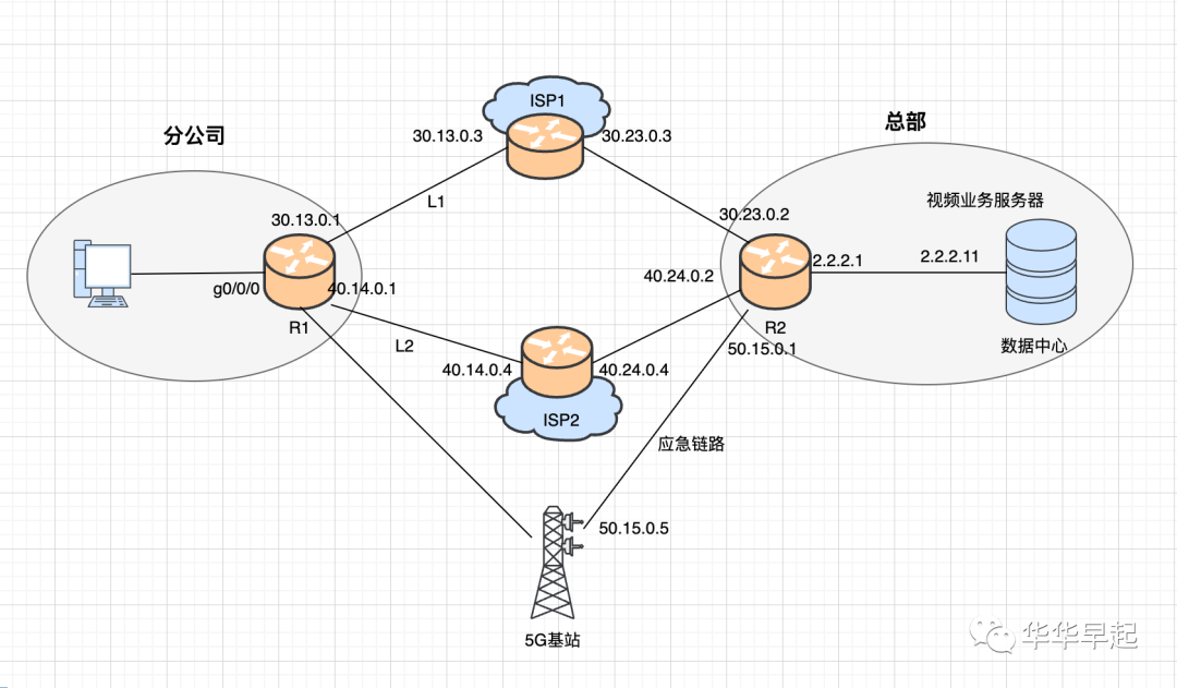 分公司和总部数据中心通过 ISP1 的网络和 ISP2 的网络互连。并且连接 5G 出口作为应急链路,分公司和总部数据中心交互的业务有语音、视频、FTP 和 HTTP 四种。要求通过配置策略路由实现分公司访问业务分流。配置网络质量分析(NQA)与静态路由联动实现链路冗余。其中,语音和视频以 ISP1 为主链路、ISP2 为备份;FTP 和 HTTP 以 ISP2 为主链路,ISP1 为备份。