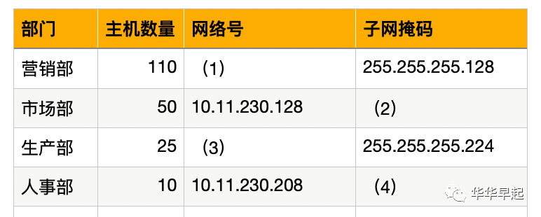 分支机构有营销部、市场部、生产部、人事部四个部门,每个部门需要访问互联网主机数量如表所示,现计划对网段 10.11.230.0/24 进行子网划分,为以上四个部分规划 IP 地址,请补充表中的空(1)-(4)。