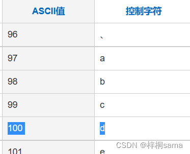 所以第一个字符的ascii值为100,通过查找ascii表可知该字符为d