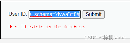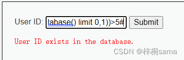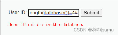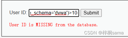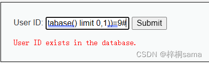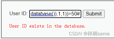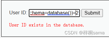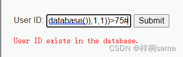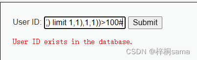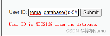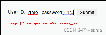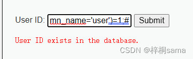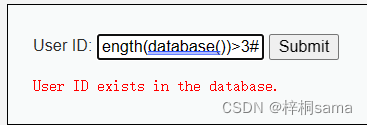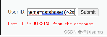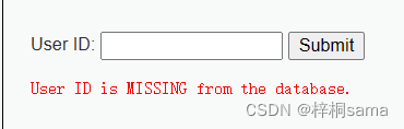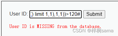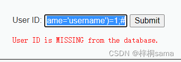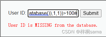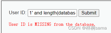 不管输入框输入为何内容,页面上只会返回以下2种情形的提示: 满足查询条件则返回"User ID exists in the database.",不满足查询条件则返回"User ID is MISSING from the database.";两者返回的内容随所构造的真假条件而不同,说明存在SQL盲注。