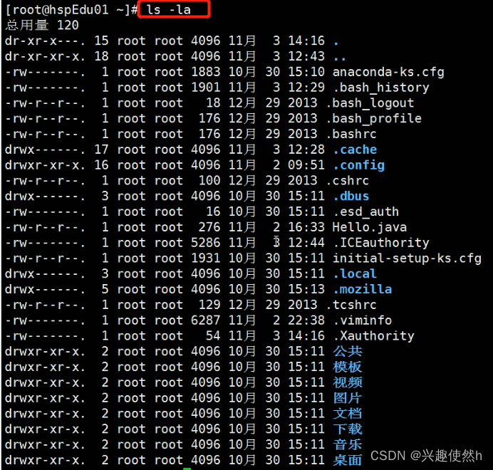 ls -la:代表一行一行输出 并且包含隐藏文件(隐藏目录)