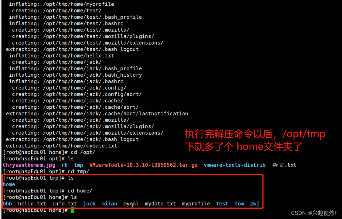 执行命令2:unzip -d /opt/tmp /home/myhome.zip (将 /home/myhome.zip 压缩文件,解压到 /opt/tmp 目录下)