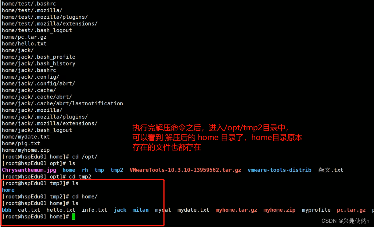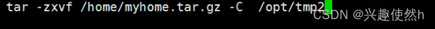 指令2:tar -zxvf /home/myhome.tar.gz -C /opt/tmp2 (将 /home/myhome.tar.gz 压缩文件 解压到 /opt/tmp2 目录下)
