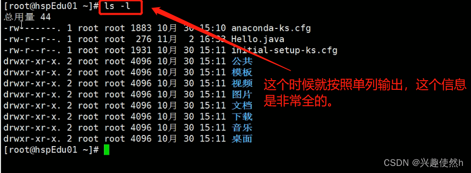 如果我们输入带选项 -l ,就会按照单列进行输出,这个信息是非常全的。(这些信息什么意思后面会具体说明,大家不用担心)