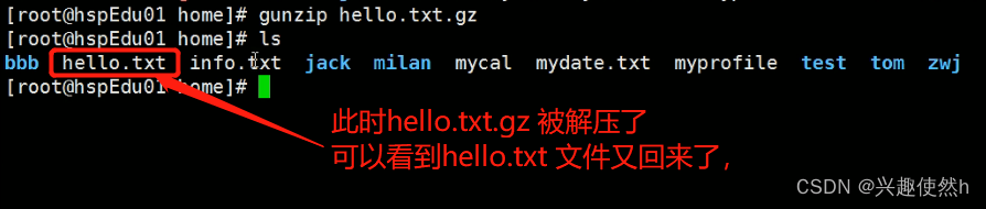 指令:gunzip /home/hello.txt.gz