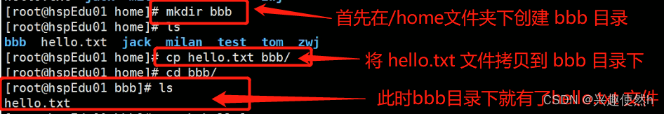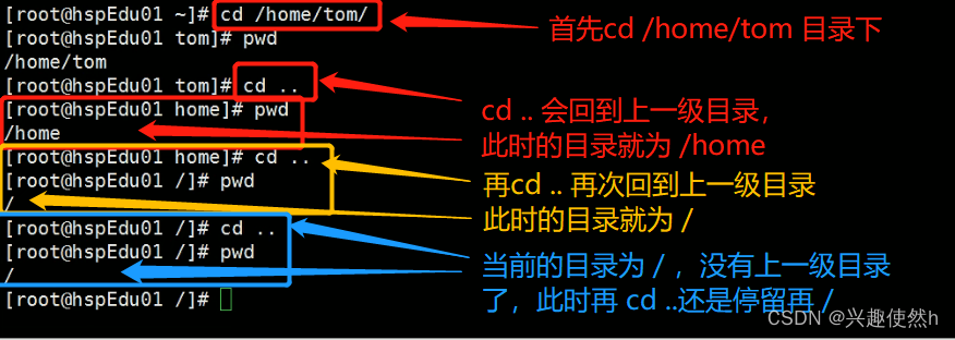 案例 2:使用相对路径到/root 目录, 比如在 /home/tom 目录下,需要使用 cd ../../root