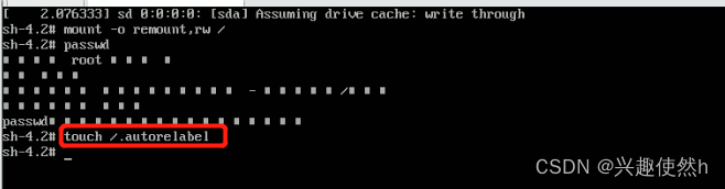 步骤六: 接着,在鼠标闪烁的位置中(最后一行)输入:touch /.autorelabel(注意:touch与 /之间有一个空格),完成后按键盘的回车键(Enter)