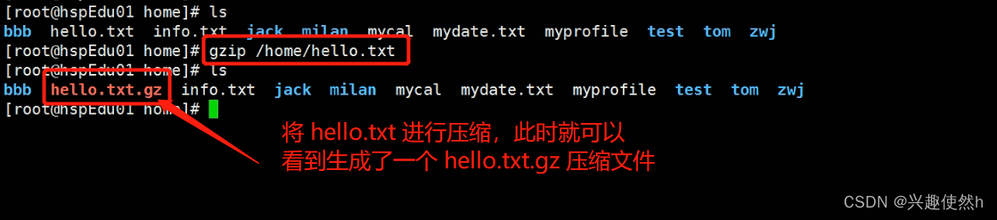 指令:gzip /home/hello.txt