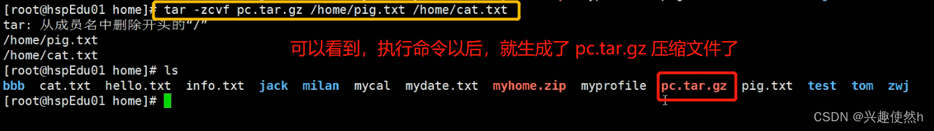案例 1: 压缩多个文件,将 /home/pig.txt 和 /home/cat.txt 压缩成 pc.tar.gz