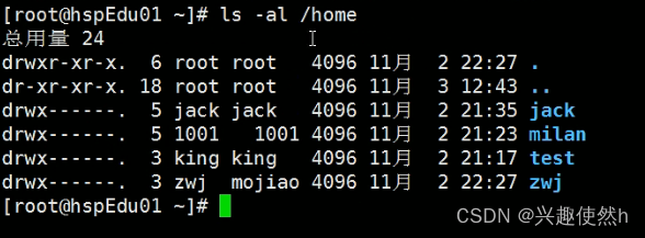 默认情况下是输出当前目录下的所有文件或文件夹,我们也可以指定输出某个目录下的所有文件或文件夹,比如 ls -al /home(把home下面的文件或文件夹显示出来,而且是以单列的形式)也可以指定其他目录。