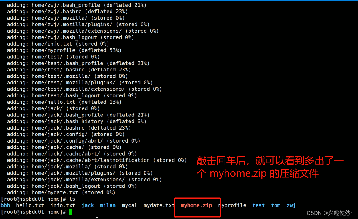 命令:zip -r myhome.zip /home/ [将 home 目录及其包含的文件和子文件夹都压缩]![]()