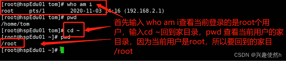 cd ~ 或者 cd :回到自己的家目录, 比如 你是 root 用户, cd ~ 会回到 /root,如果你是 tom 用户,cd ~ 会回到 /home/tom。