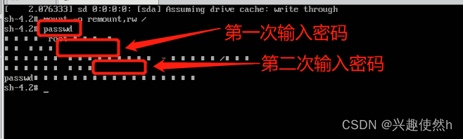 步骤五:在新的一行输入:passwd, 完成后按键盘的回车键(Enter)。输入密码,然后再次确认密码即可( 密码长度最好8位以上,但不是必须的), 密码修改成功后,会显示 passwd ■ ■ ■ ■ ■ ■ 的样式,说明密码修改成功。