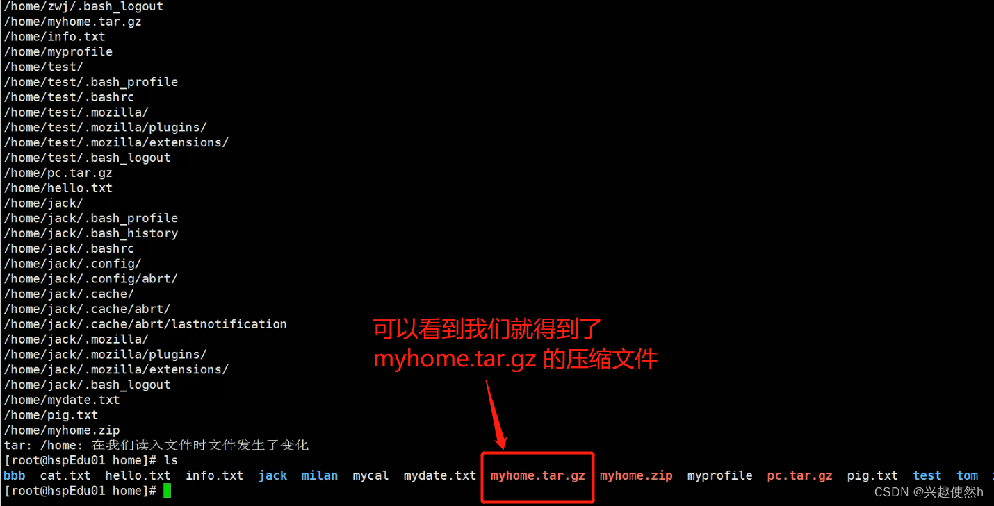 命令:tar -zcvf myhome.tar.gz /home/