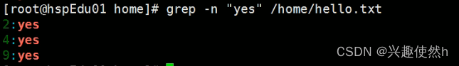 指令 2: grep -n "yes" /home/hello.txt