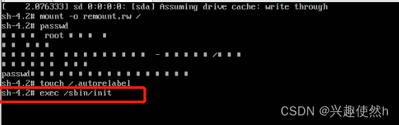 步骤七:继续在光标闪烁的位置中,输入:exec /sbin/init(注意:exec与 /之间有一个空格),完成后按键盘的回车键(Enter),等待系统自动修改密码 (这个过程时间可能有点长,有些小伙伴会认为死机了,一定耐心等待),完成后,系统会自动重启, 新的密码生效了。