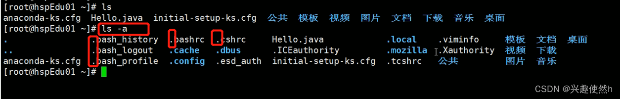 此时我们输入带选项 -a ,这个时候就会把隐藏文件(.开头的文件)全部显示出来。