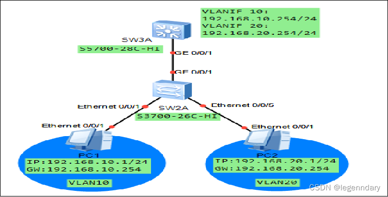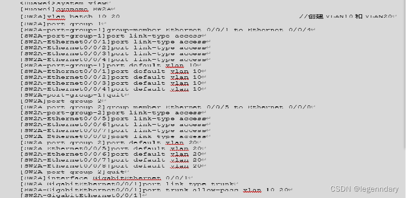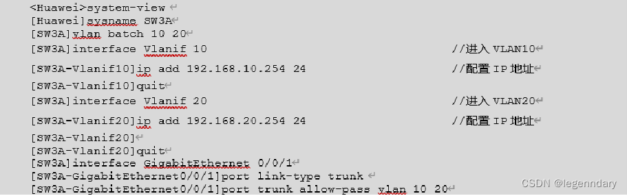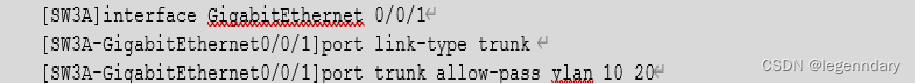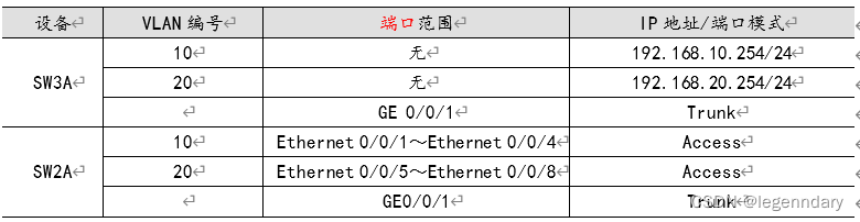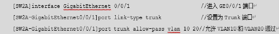 (2)在SW2A和SW3A上划分两个VLAN(VLAN10、VLAN20),并将GE0/0/1端口设置为Trunk,详细参数如表