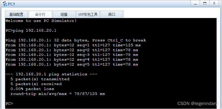 测试网络的连通性。在PC1上ping PC2计算机的IP地址192.168.20.1,发现网络是通的