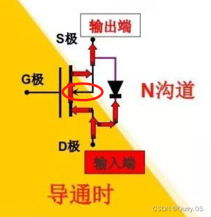 箭头指向G极的就是N沟道MOS管,作为开关时,D极作为输入端(接电源),S极输出端(接地);