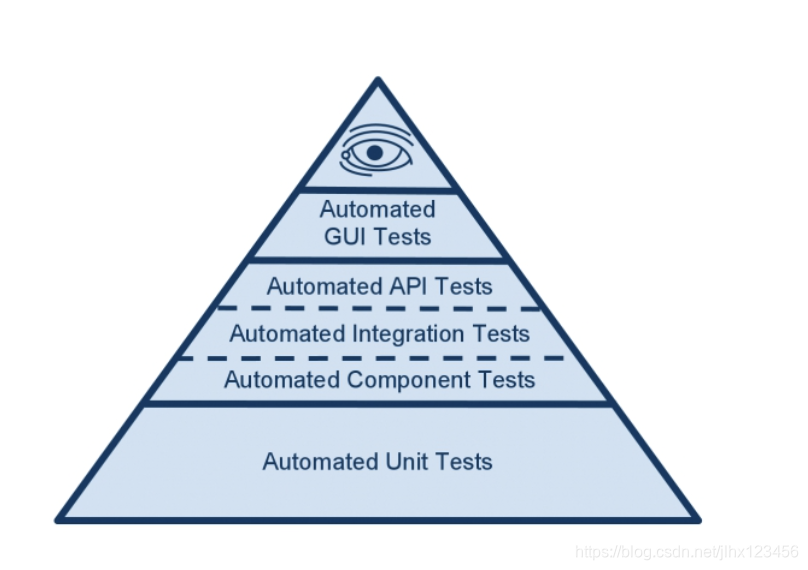 testing pyramid,类似于V模型,把测试行为从下往上分为单元测试、组件测试、集成测试、系统测试、手工测试。对于测试金字塔,越往下靠越容易自动化,越靠下成本越低,越靠下效率越高。