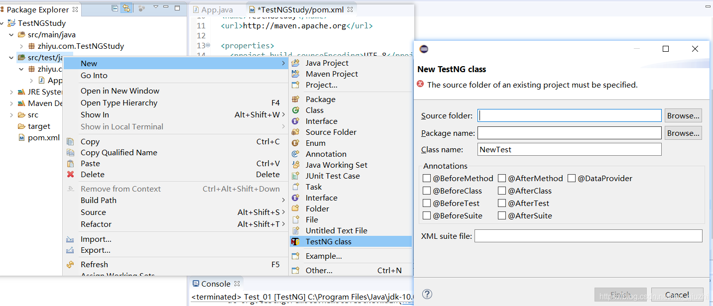 设置成功后,在新建中可以快速创建TestNG类
