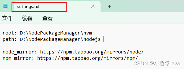 npm与Node.js的默认下载服务器均在国外,国内进行下载时往往有速度较慢的问题,我们可以通过配置为淘宝镜像进行解决。在安装目录下面我们可以找到名为 settings.txt 的文件,打开并在最后加上两行来将Node.js和npm的下载服务器地址替换为服务器在国内的淘宝镜像:
