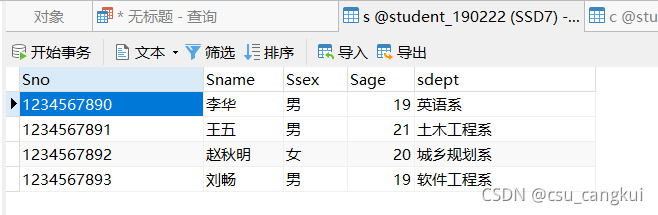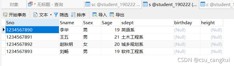 5、将以上创建表S、C、SC的SQL命令以 .sql文件的形式保存在磁盘上。在表中加入至少4个元组,第一个为本人信息。