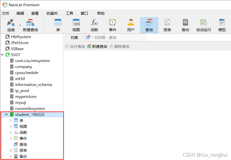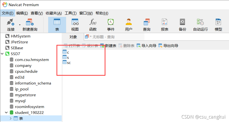 主要是学会了如何利用create语句创建数据库、利用create语句创建关系实例(表)、利用insert语句插入数据、利用alter table语句增加或者删除属性,以及合理利用Navicat这个MySQL的可视化工具进行备份与恢复,以及上述语句的一些基本语法和使用场景。MySQL的建库无法像SQL Server一样指定相关文件的存储位置和分配空间。建库的时候顺便把一些完整性约束也加进去了,比如指定sc表的Sno和Cno分别为外键。