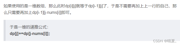 (如果使用一维,必须先遍历物品后遍历背包容量,不可以反过来。因为如果反过来,就无法使用压缩数组的核心思想:《使用上一行作为结果》)