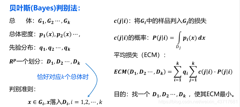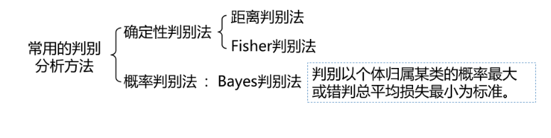 假定对研究对象有一定的认识(常用先验概率分布来描述),然后取一个样本,用样本来修正已有的这个先验概率分布,得到后验概率分布,各种统计推断都通过后验概率分布来进行。将贝叶斯思想用于判别分析,就得到了贝叶斯判别。它体现了判别方法与总体各自出现的概率大小的关系,判别方法与错判之后造成损失的关系。