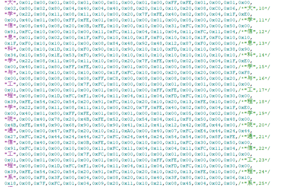 再通过font函数里,字模库字模个数,循环查找一一对比,找到即返回,这样做就使得调用时可以直接传递想要显示的汉字,(前提是把需要的汉字全都取了字模,加进去)。