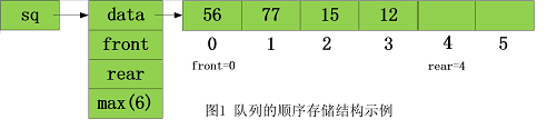 data: 给出队列存储空间的起始地址;front: 为队头指针,它指向队头元素;rear: 为队尾指针,它指向下一个入队元素的存储位置;max: 指明队列存储空间中最多可存储的数据元素个数。(通常为了区分队列空和满,会在队列尾留一个空数据单元,此时队列最多可放max-1个数据元素)