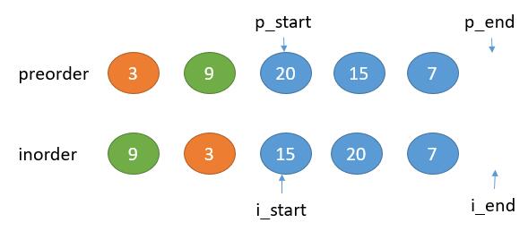事实上,我们不需要真的把 preorder 和 inorder 切分了,只需要用分别用两个指针指向开头和结束位置即可。注意下边的两个指针指向的数组范围是包括左边界,不包括右边界。对于下边的树的合成。