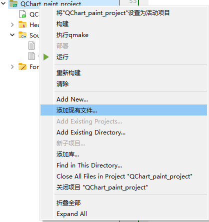 将下载文件的qcustomplot.h与qcustomplot.cpp复制到自己的项目文件中,复制完后点击“添加现有文件”,可以在工程中显示