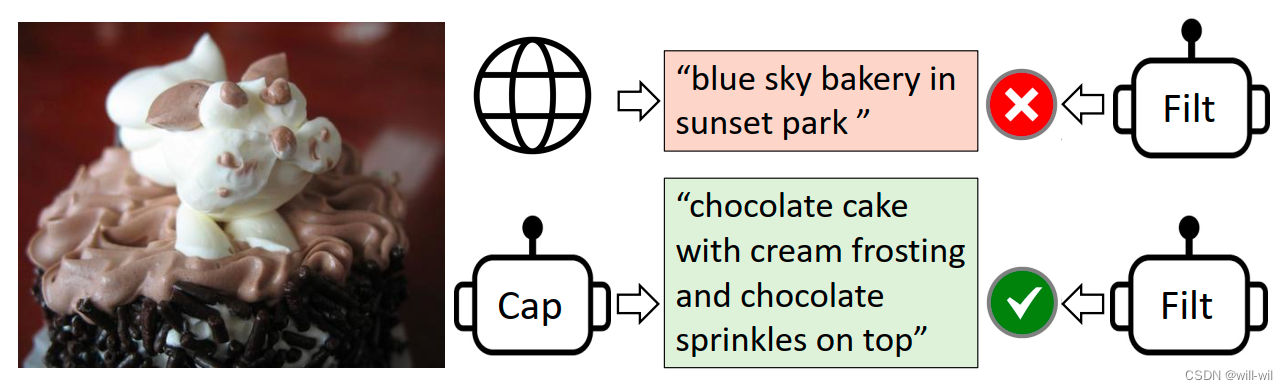 论文采用标题和过滤策略(Captioning and Filtering, CapFilt)来提高文本语料库的质量,包含了两个模块:一个是给定网络图像生成字幕的Captioner,另一个是去除噪声图像-文本对的Filter。