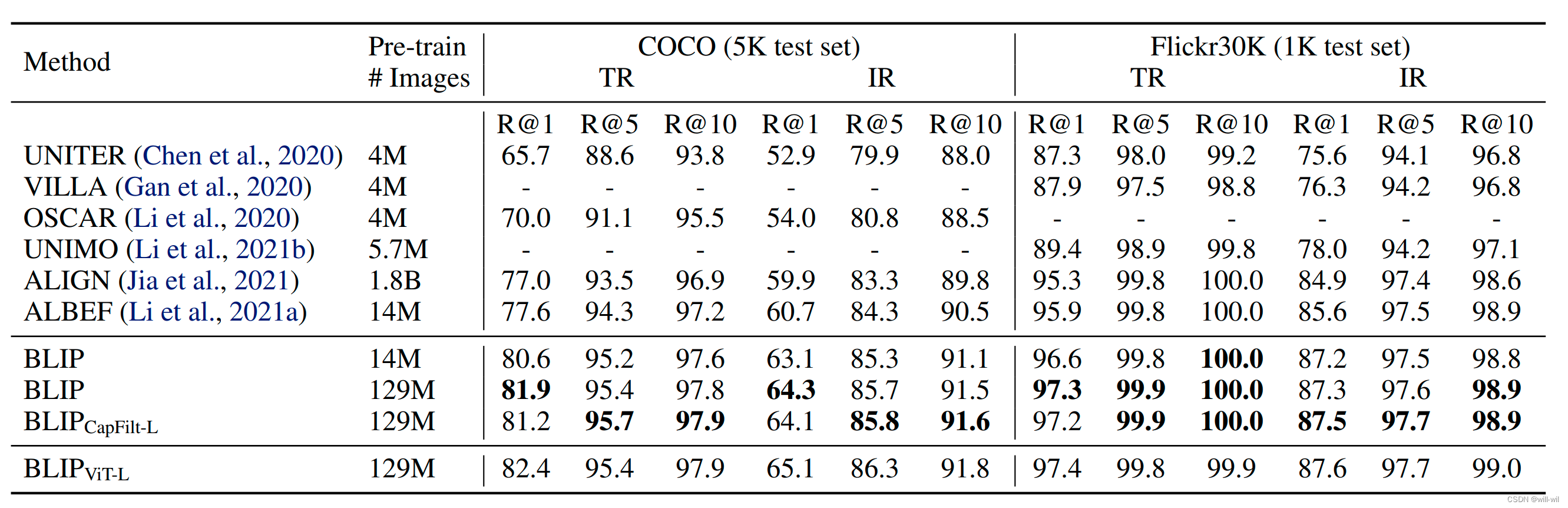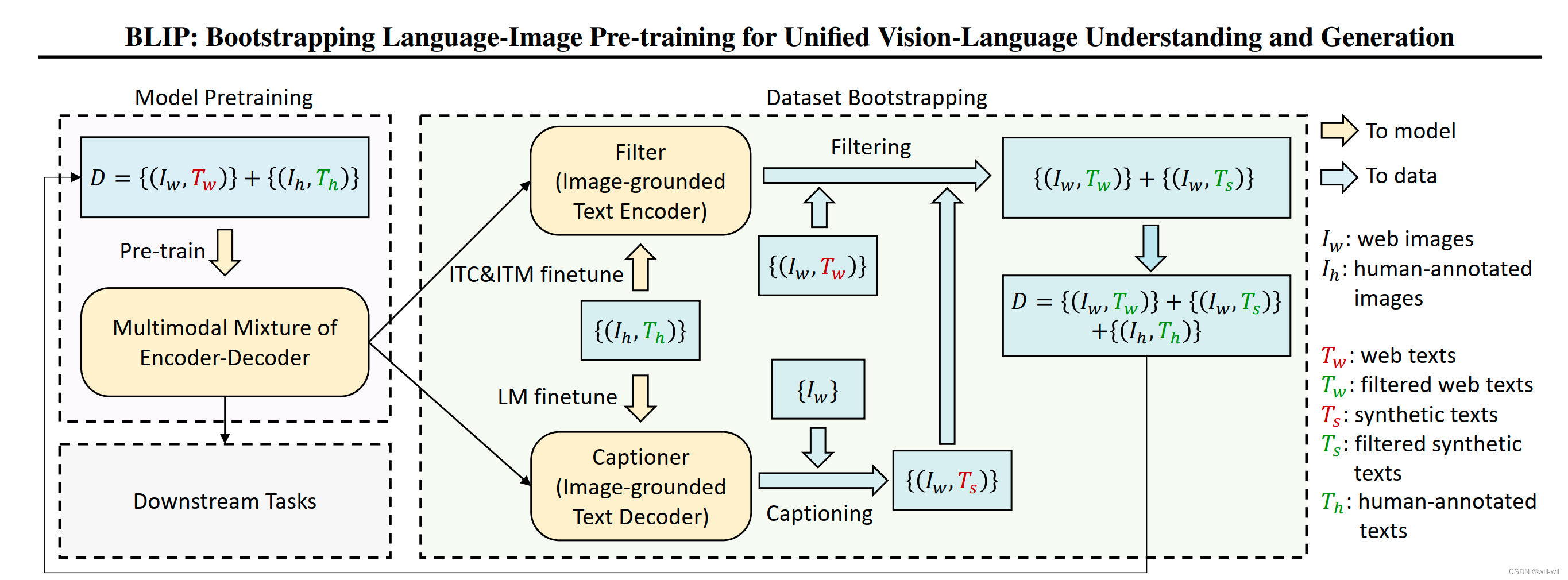 Captioner和Filter都是从同一个预训练的MED模型初始化的,在COCO数据集上单独进行微调。Captioner以LM为目标进行微调,对给定的图像进行文本解码生成caption;Filter以ITC和ITM的目标进行微调,以学习文本是否与图像匹配,该Filter去除原始网络文本和合成文本中的噪音文本,如果ITM头预测一个文本与图像不匹配,则该文本被认为是噪音。