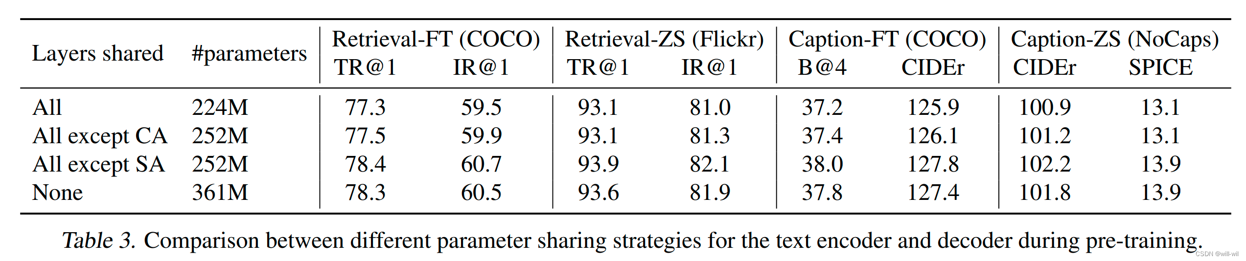 text encoder和text decoder 共享除了SA layers的参数,encoder参数指向decoder参数。