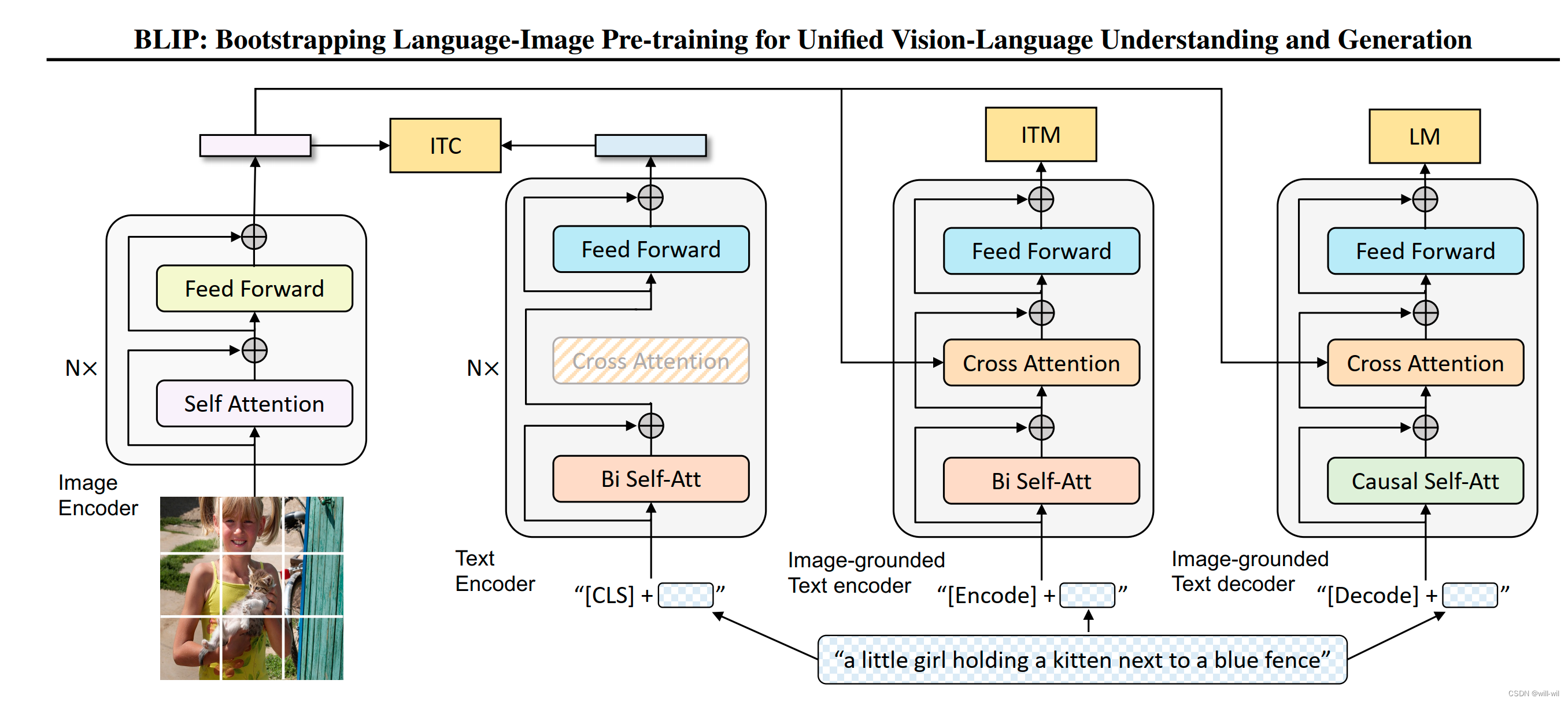 语言建模损失(Language Modeling Loss, LM)激活了以图像为基础的文本解码器,其目的是生成给定图像的文本描述。它优化了交叉熵损失,训练模型以自回归的方式最大化文本的概率。