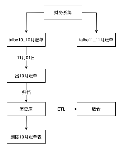 举例,按月维度分表:财务或者计费类系统会在月底统计当月账单,相关的业务执行完后表中的数据是静态化了,之后不会使用到这些数据,当月账单出完后,可以归档到历史库,供数仓ETL做分析报表,确认数据同步到历史库后库,可以从业务库中删除已同步月份的数据,释放表空间。