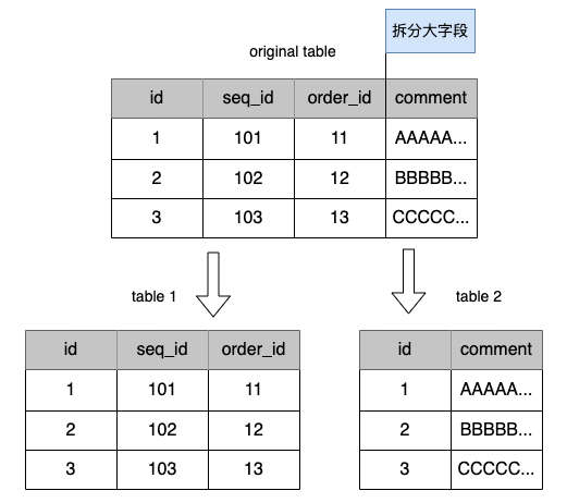 依据二八定律(帕累托法则),频繁使用的字段往往只占所有字段中的一小部分,因此可以将高频使用字段的数据放在一张表,将剩余字段的数据放在另一张表。