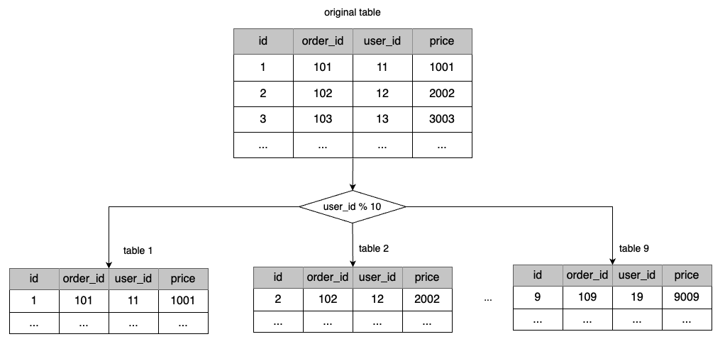 依据业务的增长情况,估算一年后的数据量,将整个数据表拆分为n个子表(参考单表数据不超过500w行规定),拆分过程使用ID取模法,即id % n,将每个数据行拆到对应的子表中。