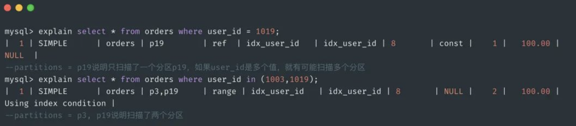 从执行计划可以看到,通过分区键user_id过滤,直接可以定位到数据所在的分区 p19(user_id =1019 % 20 = 19,所以在p19分区上),进而去访问p19对应的数据文件 orders#p#p19.ibd 即可获得数据。