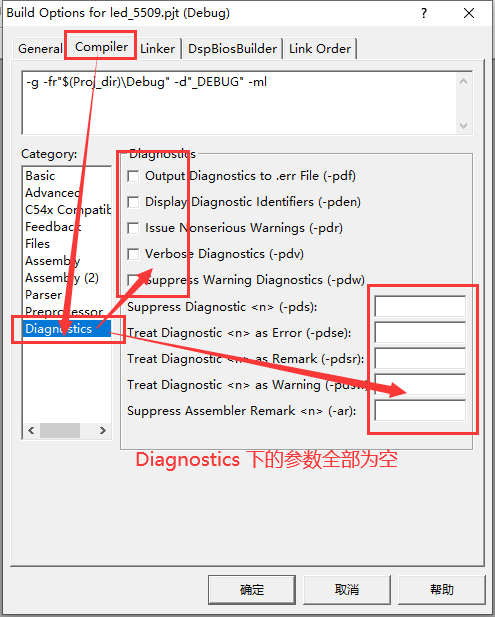 接着,确认"Compiler"->"Diagnostics"下的参数是不是全部为空,如果不是,需要修改: