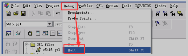 程序在运行时,可以在菜单栏"Debug"->"Halt"暂停程序: