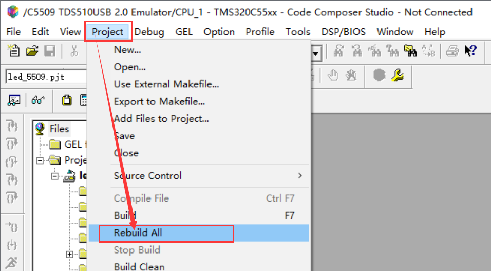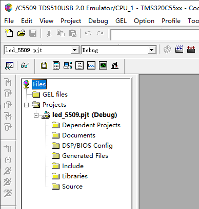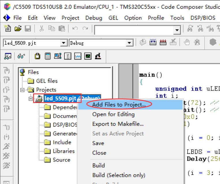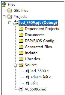 在项目栏对工程右键,选择"Add Files to Project...",将工程对应的路径下的"led_5509.c"、"sdram_init.c"、"util.c"和"VC5509.cmd"添加到工程中(按住ctrl键可以同时选中多个,一并添加到工程中)。