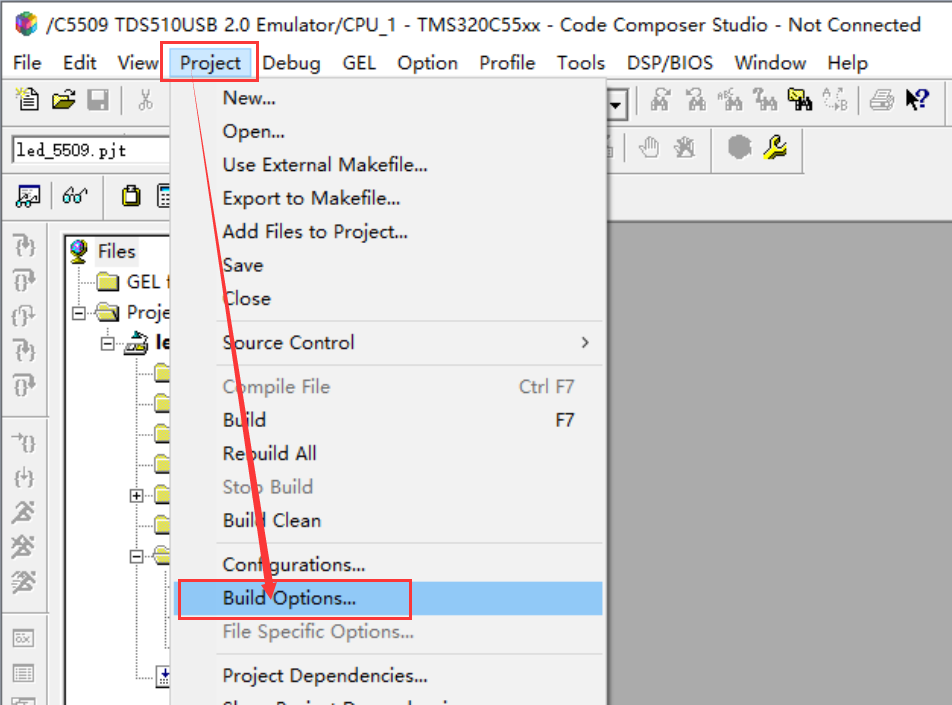 在菜单选则"Project"->"Build Options..."来对工程进行配置: