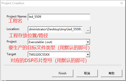 在弹窗"Project Creation"中,输入工程名字、工程位置、工程最终要生成的文件类型(默认为.out可执行文件)和对应的DSP芯片型号(默认即可)。